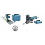 Il kit di elettroutensili Makita MEU029J viene fornito con la praticissima sega circolare ad affondamento SP6000J con 2 lame da 165 mm e motore da 1300w , seghetto alternativo Makita 4351FCTJ con capacità taglio legno fino a 135 mm e led di illuminazione e il comodissimo binario guida 199141-8 da 1500 mm.