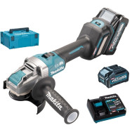 Smerigliatrice angolare 40Vmax dotata di potente motore brushless (1100W) , velocità regolabile da 3.000 – 8.500 giri/min tramite regolatore e funzione di freno elettrico per arresto rapido del disco. Aggancio disco X-LOCK. Fornito con due batterie da 4Ah, e caricabatterie rapido DC40RA, fornito con valigetta MAKPAC tipo 4 (821552-6).